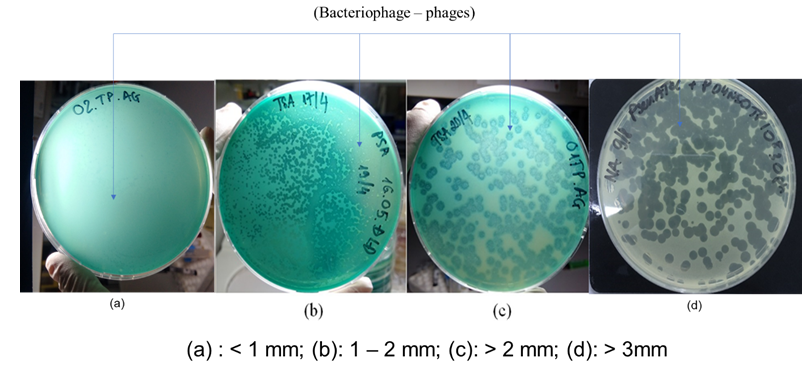 Pseudomonas aeruginosa ATCC 27853 and Pseudomonas aeruginosa isolated from patients, soil was applied as indicator to phage isolation. Based on double layer agar methods (8), 300 ml of bacterial indicator solution (108CFU/ml) mixed with 100ml samples and 2.6ml of top agar (0.5% bacteriological agar), then poured onto TSA (ThermoFisher products). Following this, the plates were left to balance and dry on the bench for 25 minutes before inverted to incubate at 37ºC overnight. Any determined plaques were harvested by sterile needle and resuspended into 3ml LB media contained indicator, then shaked in 3 hours. Next steps, all mixture filtered through membrane 0.2µm to collect pure lysate as phage. The whole procedure was repeated at least three times to obtain the single clone of phage. All phage was stored at 4ºC for further test.