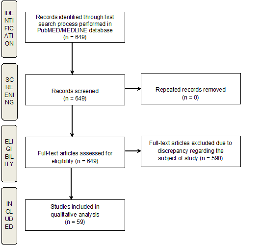 Based on the search strategy, 649 publications were retrieved. After analyzing the content according to the eligibility criteria, 59 studies were included in the final sample. Regarding the 590 excluded articles that have not addressed the involvement of atypical agents in UTIs.