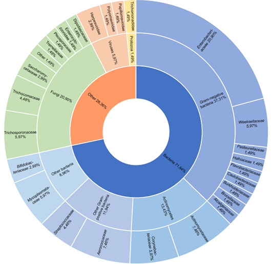 Considering the microorganisms found, most studies dealt with bacteria, more precisely 42 (71.19%). Among them, 25 (42.37%) studies reported Gram-negative bacteria, representing the largest group in this review; followed by Gram-positive bacteria which accounted to 15 (25.42%) of these studies, of which 9 addressed actinomycetes. In addition, there was a publication about Gram-variable bacteria (1.69%) and one about members of the Mycoplasmataceae family (1.69%). The others consisted of 14 (23.73%) studies involving fungi, 2 (3.39%) involving viruses, and a study (1.69%) addressing numerous agents (viruses, bacteria, fungi, and protozoa).
