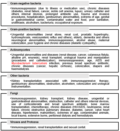 Overall, most of the studies demonstrated that the risk factors have an association with: (i) intrinsic individuals condition such as advanced age, female gender, enuresis, preexistence of chronic diseases, prostatic hyperplasia, immunocompromised individuals, obstruction, genitourinary tract anatomical alteration, or cancer. (ii) exposure to risky situations, for instance, diapers usage, long-term urinary catheter usage, and other invasive procedures involving the urinary tract manipulation, chemotherapy for cancer, alcoholism, prolonged use of antibiotics, and even risky sexual behavior. Mostly, the microorganisms assessed in the present study show opportunistic pathogens characteristics.