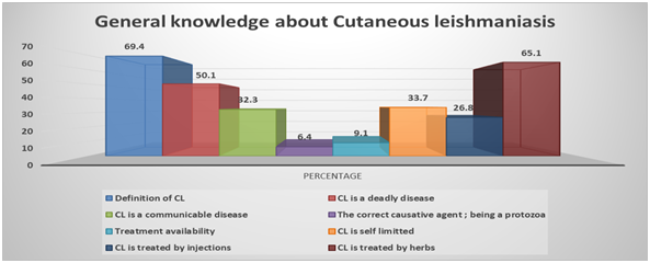 Results: Mean age of participants was 34 years and the main age group was 25-35 years. Males constituted (67.8%) of subjects and majority of the participants were either illiterate or had low level of education. Although most of the participants in the current study (69.4%) reported they were aware about CL, their depth of knowledge was poor as only few participants (6.4%) had sufficient information about the causative agent of CL and (9.1%) of them knew that treatment of CL is available. 26.8% only of the respondents gave the right answer that treatment of CL is medically, and only 33.7% knew the Cl is a self limited diseases, while ( 65.1%) of the respondents thought wrongly that CL is treated by herbal preparation. About half of the respondents (50.1%) believe wrongly that CL is a deadly disease and 90.9 % of them thought wrongly that CL has no available treatment. As expected, the main source of information in the current work was the internet and social media (76.3%). Unfortunately, (32.3 %) of the respondent mentioned wrongly that mosquito bite was a possible cause of CL while only (5.4%) of the participants knew the correct vector transmitting CL which is the sand fly. 34.4% of contributors only knew that CL affects mainly face and extremities and 54.3% recognized that the disease affects mainly children. Majority of the respondents (73.0%) of the participants knew that CL cause blister or ulcer.