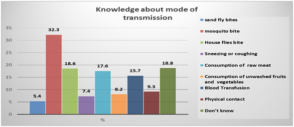 Concerning the knowledge about the mode of transmission, unfortunately the high percentage of the respondent (32.3%) mentioned wrongly that mosquito bite was a possible cause of CL while only (5.4%) of the participants knew the correct vector transmitting CL which is the sand fly. Unexpectedly, 18.6%, 17.6.1 %, 7.4 %, 8.2%, 9.3% of respondents believed wrongly that house fly bites. Consumption of raw or inadequately cooked meat, sneezing or coughing, consumption of unwashed vegetables and fruits, and physical contact can transmit CL respectively (Table 10). This unsatisfactory knowledge about the sand-fly vector transmitting CL in the current study is in keeping with similar studies conducted in Al-Ahsaa, Saudi Arabia where only 37.4% of participants could identify sand fly as the vector of CL. In another study by Hejazi et al.,11 only 13.9% of respondents had enough information about sand fly vector. Findings of Alexander et al., in Brazil, revealed that 23.1% of the study population were aware about sand fly as the vector of CL.21 On the contrarily to our study , in Isfahan , the knowledge was very high as 97.9% of their respondents were aware that sand flies carry the CL.22
