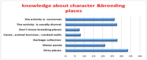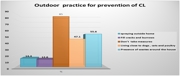 Unluckily, majority of participants (85.0%) living in houses didn’t know about the suitable preventive measures outdoor. However 14.4% of them used to spray insecticides outdoor and 12.6 % of them used to fill the cracks and animal burrows outside their homes. Unfortunately 47.1% said that they are living close to animals like dogs, cats, cattle and poultry. 55.6% had wastes around the house (Table 14). In a study conducted in Alexandria, Egypt, 51.7% of the respondents have animals such as dogs, cats and cattle inside or around the house, (30%) breed poultry and (61.7%) of the respondents said they have rodents either inside or around their houses. The vector of CL (phlebotomas papatasi) is proved to be anthropophilic and beside human blood, it feed also on animals, rodents and poultry. Many authors agreed to this, among them Svobodová et al.,23 who found that P. papatasi feed on domestic animals and wild rodents and to lesser extent on poultry blood. Moreover, in 2005 Ershadi et al.,24 in Iran proved the same fact Svobodova et al.23 Like the present study, (66.7%) of the surveyed houses Iran study had a dump place or wastes around the house. Waste is considered a breeding place for sand fly Müller & Gomes,25 several authors agreed that poor housing conditions and unsuitable waste management was suspected to provide ideal conditions for sand fly breeding.26,27