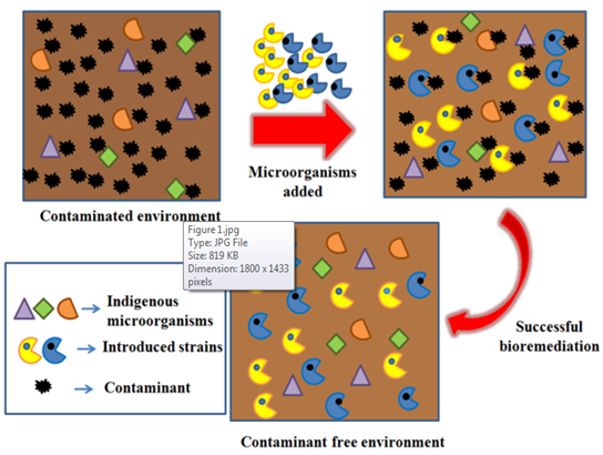 Some other techniques that are under development includes extraction of pollutants with organic solvents, oxidation of organic pollutants under subcritical or supercritical conditions, vitrification, electro-reclamation, dehalogenation of chlorinated organic compounds, chemical reduction or oxidation of contaminants, steam stripping, plasma torch techniques etc.31,32 Out of these techniques mentioned above, the biological method for the removal of soil contaminants was considered as the most potent and environmentally friendly approach.33 This approach is covered under an umbrella term called bioremediation. By definition, bioremediation is described as the use of microorganisms to destroy or detoxify waste materials.34,35 Biological approach for elimination of soil contaminants involves a wide array of microorganisms. The reason behind this is their biodiversity and vast catabolic potential.36,37 For effective removal of the recalcitrant compounds from the soil, the best biological approach is considered to be the “in-situ bioremediation”. This process of detoxification targets the harmful chemicals by mineralisation, transformation, or alteration.38,39 Bioremediation at its natural pace is incapable of eliminating the toxic and hazardous waste from the environment considerably. In order to enhance the degradation rate of the waste through bioremediation, bioremediation is been coupled with two other approaches named as bioaugmentation and biostimulation.