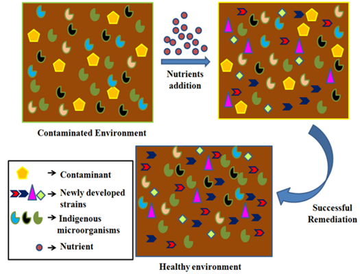 Biostimulation is a remediation technique that is highly efficient, cost effective and eco-friendly in nature. Biostimulation refers to the addition of rate limiting nutrients like phosphorus, nitrogen, oxygen, electron donors to severely polluted sites to stimulate the existing bacteria to degrade the hazardous and toxic contaminants.4,67‒69 Figure 2 outlines the process of biostimulation.