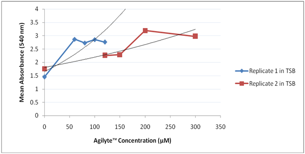 Figure 4 Effect of Agilyte™ on PA14 biofilms grown in TSB at 35°C for 24 hours. Mean absorbance based on five replicate samples.