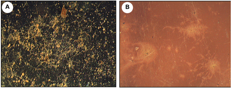 Figure 1 Images obtained from a stereomicroscope (20X) showing microbial colonization of the films analyzed. a) Film A and b) Film B.