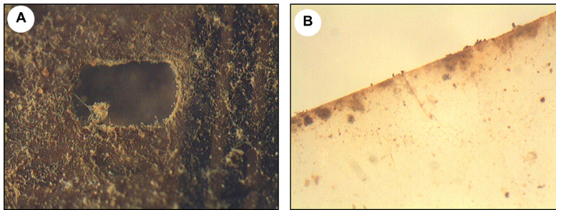 Optical microscopy (stereomicroscope) showed obvious signs of biodeterioration in the two films studied, although to varying degrees (Figure 1). While the film A was completely covered by a dense biofilm, the film B showed only dark spots. In addition, it was evidenced that the development of microorganisms, preferably fungi, occurred primarily along the edge of the cinematographic film and perforations, instead of being in the center of the film (Figure 2).