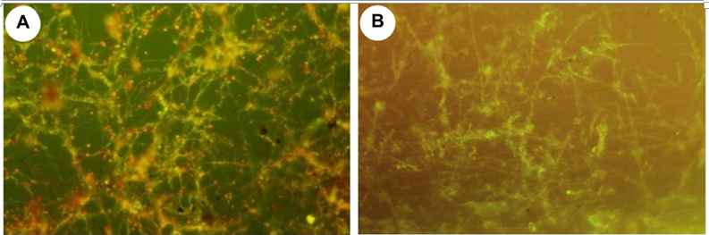 Figure 3 Epifluorescence micrograph of films stained. Viable fungal mycelia can be observed. a) Film A and b) Film B.