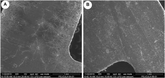 Within the Aspergillus genus, A. versicolor was the predominant species in the film A as in previous reports.11,15,37 This species was also isolated from photographs13,42 and glass plate negatives with gelatine as emulsion.43 Furthermore, A. sydowii and A. flavus were also isolated lesser extent. Aspergillus unguis was another species identified within the genus, but corresponding to the film B. These species were also previously isolated from ICAIC cinematographic films by Gomez.37 The behavior obtained in the film A was expected, since this film was the most biofouling and was the most biological diverse in that biofouling. Through SEM it was evident that this film had many exoskeletons of dust mites, which served as additional nutritional source for the development of an abundant and thick fungal biofilm.