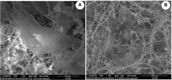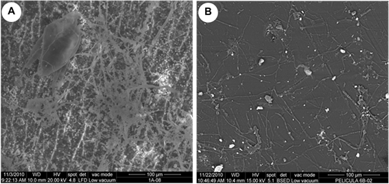 The observation made by ESEM confirmed that both sides of the films had microbial growth with differing degrees of colonization (Figure 4) but the microbial growth was different between the films analyzed being the film A was the most contaminated (Figure 5).