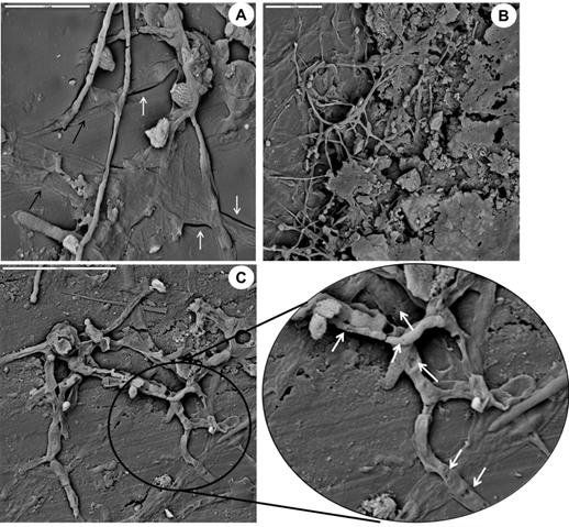 Figure 6 SEM micrographs of the film B. a) Hyphae penetration in the support (black arrows) causing mechanical damage in the form of cracks (white arrows). b) Extracellular polymeric substances produced by fungi as part of the biofilm. c) Small holes in fungal structures (white arrows) resulting from the lytic activity of the bacteria.