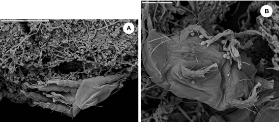 Figure 8 SEM micrographs showing the mite exoskeletons as part of the biofouling existing in the analyzed biofilms. a) Exoskeleton of an adult of the Tydeidae family. b) Exoskeleton of a larva of the Tarsonemidae family.