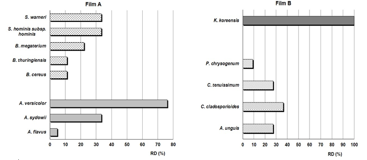 In the case of bacteria, Bacillus was the predominant genus in the film A with three species (B. cereus, B. thuringiensis and B. megaterium) followed of the Staphylococcus genus with two species, S. hominis and S. warneri. In the film B only one species was isolated and belongs to the Kocuria genus (K. koreensis) (Figure 9).