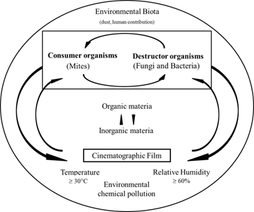 The results obtained in the studied films expected, since at the time of sampling were stored in a repository without air conditioning and the average values of temperature and relative humidity were 31°C and 65 % respectively. In the repository had a strong smell of vinegar due to the presence of volatile organic acids such as acetic acid and propionic acid which are emitted during the chemical deterioration of the films of cellulose acetate called “vinegar syndrome”,8,18,20 indicating a high probability that the supports were acids. The films were not protected in adequate packaging and the way they were placed did not allow for systematic cleanings. Thus, environmental conditions, biota and environmental chemical contamination present on the site in conjunction with organic and existing inorganic matter in the films favored the development of destroying organisms that used organic matter for nutrition and changed the structure the cinematographic films. This is the case, first fungi on environmental conditions listed and nutrient availability in the films were easily developed and formed a dense biofilm as observed by ESEM, even was observed that they remained strongly adhered to the surface of films after treatment of the SEM. It is also the case of the bacteria that are active but latent state (speed delayed growth), since are disadvantages regarding fungi because they require for their development of higher water activity and a neutral or slightly basic pH, aspects that were not favorable for its development; although they surely also metabolized the components of the films and the other nutrients provided by the fungi. In general, the damage caused by bacteria is less than those provoked by fungus under these conditions. If each piece of film were considered as an ecosystem, it can be suggested that the existence of consumer organisms knew how to take advantage of the living material provided by other organisms that directly damaged the support. Such is the case of mites that feed on fungi, and these exoskeletons and excreted substances served, in turn, as additional nutrients for the fungal growth. Likewise, these fungi were a nutritional source for bacteria, thus giving rise to an ecological succession that is summarized in figure 10.