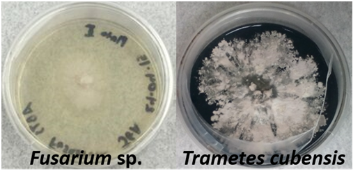 Figure 1 Differential media with modified Malt Extract Agar containing ABTS (2,2'-azino-bis(3-ethylbenzothiazoline-6-sulphonic acid) were used to examine the lignolytic capability of fungal isolates from Puerto Rico. The agar turns green due to the oxidation of ABTS. An isolate of Trametes cubensis exhibited significant ABTS oxidation compared to a Fusarium sp. isolate showing no indication of ABTS depolymerization.