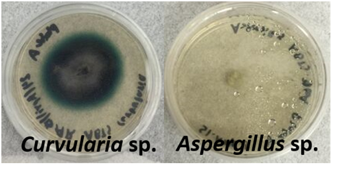 Figure 2 Differential media with modified Malt Extract Agar containing ABTS (2,2'-azino-bis(3-ethylbenzothiazoline-6-sulphonic acid) were used to examine the lignolytic capability of fungal isolates from Puerto Rico. The agar turns green due to the oxidation of ABTS. An isolate of Curvularia sp. exhibited significant ABTS oxidation compared to an Aspergillus sp. isolate showing no indication of ABTS depolymerization.