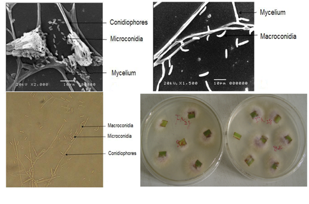 Figure 1 Fungal colony growing on the PDA medium, and its conidiophores, microconidia, macroconidia and mycelium.