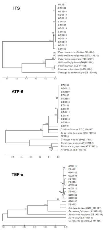 Most of the isolates of the present study showed a similar grouping pattern in case of the three gene sequences, however, ITS and TEF-α more conservative than ATP-6ATPase gene in 15 isolates of F. verticillioides.