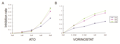 Figure 1 VORINOSTAT and ATO alone showed inhibition of proliferation on U266 cell line. 5×104 cells / ml were seeded to a 96-well culture plate in a final volume of 100μl. After 24, 48, and 72 h of treatment, 10μl of CCK-8 was added into each well and incubated for 1-4 h. The absorbance at 450 nm was measured using a microplate reader. Inhibition rate=[(control group - experimental group) / blank group]×100%. (A)The proliferation curve of ATO alone is shown. (B)The proliferation curve of VORINOSTAT alone is shown.