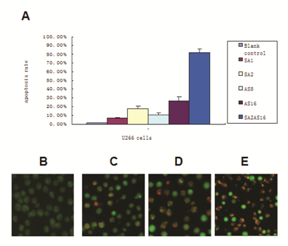 U266 cells and the drugs were co-incubated as described above. Suspended cells (95μl, 5x106/ml) were mixed with acridine orange/ethidium bromide(AO/EB)(5μl). Immediately after mixing, one drop of suspended cells was placed on a clean glass slide and observed by fluorescence microscopy at an excitation wavelength of 490 nm. Cells with green fluorescence in the nucleus and cytoplasm were normal cells; cells with yellow-green fluorescence in the nucleus or cytoplasm were apoptotic cells; cells with red fluorescence in nucleus were necrotic cells.