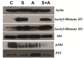 Both vorinostat and ATO alone and in the combination group showed lower levels of pAkt expression. The vorinostat group and the combination group showed increased levels of Acetyl-Histone H3 and Acetyl-Histone H4 protein expression. There were no significant changes of Akt protein in vorinostat,ATO alone and combination group. However, the combination group showed lower levels of pAkt protein expression than vorinostat or ATO alone, suggesting less of the acitivation of Akt when combining ATO and vorinostat together. Interestingly, ATO alone showed higher P53, which can be reversed with the combination of vorinostat (Figure 3).