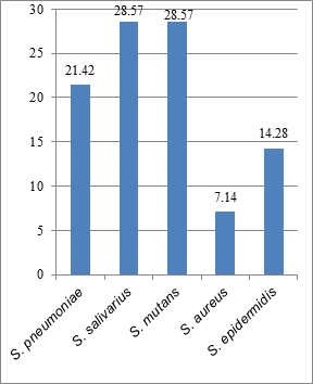 Streptococcus salivarius (28.57%) and Streptococcus mutans (28.57%) was found to be most prevalent among the smokers followed by Streptococcus pneumoniae (21.42%). Five microbial isolates were identified from the oral cavity of smokers.