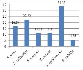 Staphylococcus epidermidis (33.33%) was found to be the most prevalent among non-smokers followed by Streptococcus salivarius (22.22%). Seven microbial isolates were identified among non-smokers. Only two potential pathogens Staphylococcus aureus (11.11%) and Bacillus subtilis (5.56%) were isolated from oral cavity of non-smokers.