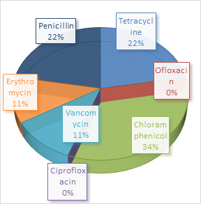 It was observed that most of the organisms showed resistance to Chloramphenicol (37%) followed by Tetracycline (11%), Erythromycin (11%) and Penicillin (25%). None of the organisms showed resistance to Ofloxacin and Ciprofloxacin.