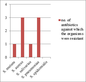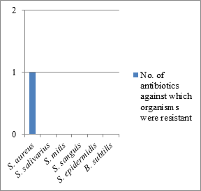 Among the isolates recovered from non-smokers, only Staphylococcus aureus was the resistance to Tetracycline. Similar to what was observed in samples collected from oral cavity of smokers, the commensals isolated from the oral cavity of non-smokers also did not show any resistance towards the antibiotics used.