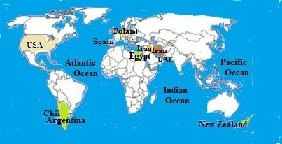 Figure 2 Location map of the new genera and species in different localities in the world: North America (USA) and South America (Chile, Argentina), Europe (Spain, Poland), Middle East (Egypt, Iraq, UAE, Iran), and South Pacific (New Zealand).