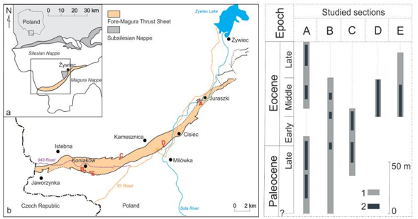 Figure 3 Location of studied sections (including Juraszki, A section) in the western part of the Polish Outer Carpathians (after Baliniak).16