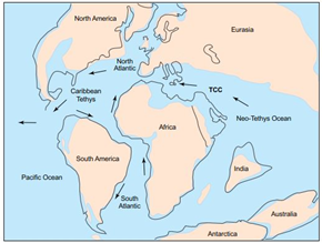 Figure 6 Paleogeography of the Neo-Tethys ocean during the late cretaceous-Paleogene times showing the flow direction of the Tethyan Circumglobal Current (TCC) from east to west, and from north to south (after Abed).29