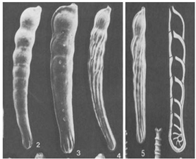 Moreover, the rectilinear Figure specimen no. 5, Plate 450 (in Loeblich & Tappan)2 is treated here as another new genus: Vaginulinella, with ornamented surface (as Vaginulinoides), but with erected non-curved test. It is look-like what were happen for the separation of the two ornamented genera Dentalina (curved test with longitudinal ribs along the surface of the test (Figure 19, Plate 439, in Loeblich & Tappan)2 and Pyramidulina (rectilinear test with longitudinal ribs along the surface of the test (Figure 6, Plate 441, in Loeblich & Tappan).2