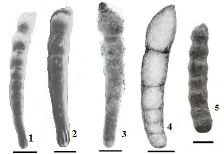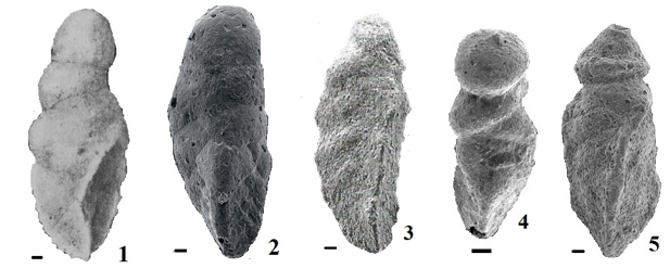 Plate 3 Figures 1, 2. Vaginulinopsis carinata (Silvestri)3 from Italy, 3. Vaginulinopsis argentinica Anan6 (=Laevidentalina sp. Jannou et al.7 plate. 21, plate 2, Figure 5) from Argentina, 4. Vaginulinopsis deserti (Said & Kenawy)8 (=Marginulinopsis deserti Said & Kenawy8, plate. 132, plate 2, Figure)23 from Egypt, 5. Vaginulinopsis emiratensis (Anan9 1993)(=Marginulinopsis emiratensis Anan9 plate. 657, plate. 2, Figure. 12) from UAE.