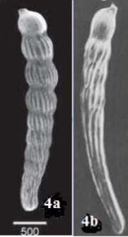 Remarks: The Vaginulinoides fingeri Anan (new genus and new species) resemble the genus Vaginulinopsis Silvestri3 in main characters of the test, except the ornamented longitudinal ribs on the test surface of the former, than the smooth test in the latter. The ornamented ribs are covered the chambers in the holotype specimen (Figure 4a), while it exists in the chambers and extended along the test crossing the sutures in the paratype specimen (Figure 4b), Plate 4a & 4b.