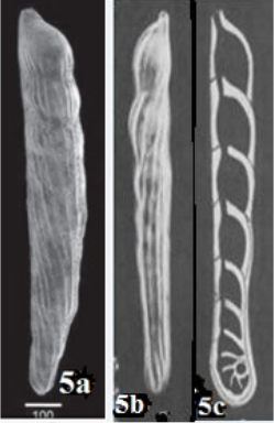 Remarks: The Vaginulinella fingeri Anan (new genus and new species) resemble the genus Vaginulinoides Anan (n. gen.) in main characters of the test, except the rectilinear test than curved, ornamented longitudinal ribs along the test surface. The ornamented ribs are covered the chambers and crossing the sutures, inclined in the holotype specimen (Figure 5a), while vertical and extended along the test crossing the sutures in the paratype specimen (Figure 5b). The Figured specimen (Figure 5c) explained the longitudinal section of the test (after Loeblich & Tappan)2