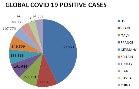 Figure 1 The above pie illustration depicts the global COVID 19 positive cases as on 26th April 2020.16
