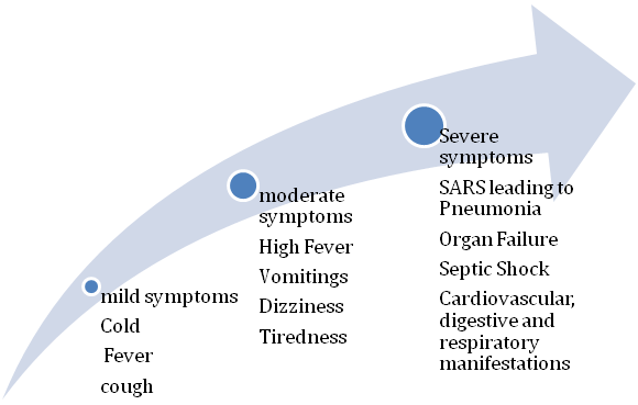 The infected patient exhibited symptoms ranging from dry cough, fever, sour throat to septic shock, pulmonary edema, multiple organ failure, pneumonia and ARDS (acute respiratory distress syndrome).38 Older adults and patients with prior health complications are highly susceptible to CoV infections. Patients with the history of digestive, respiratory ad endocrine diseases needs special attention as the possibility of clinical severity is high among them.18 Signs and symptoms of corona virus disease 19 (COVID-19) appear between 2 to 14 days in an individual after exposure. The time from the entry of the virus till the appearance of clinical signs is called as incubation time. Apart from breathing difficulties, fever and cough, persistence of other signs like sore throat, diarrhea, tiredness and severe vomiting have been related to COVID19.