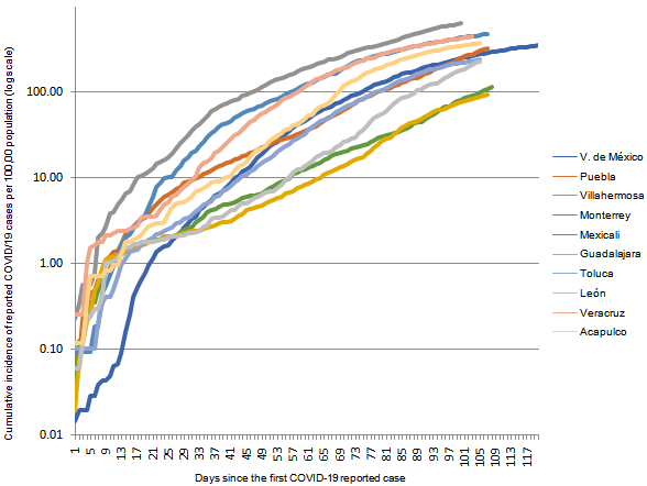 Results: At the time of the data cut-off point, COVID-19 confirmed cases in the Valle de Mexico metropolitan area are more than 233 000, with a cumulative incidence of 183 cases/100 000 habitants. Even though Valle de Mexico has the highest reported number of cases, it is Villahermosa city which has the highest cumulative incidence with 647 cases/100 000 habitants.