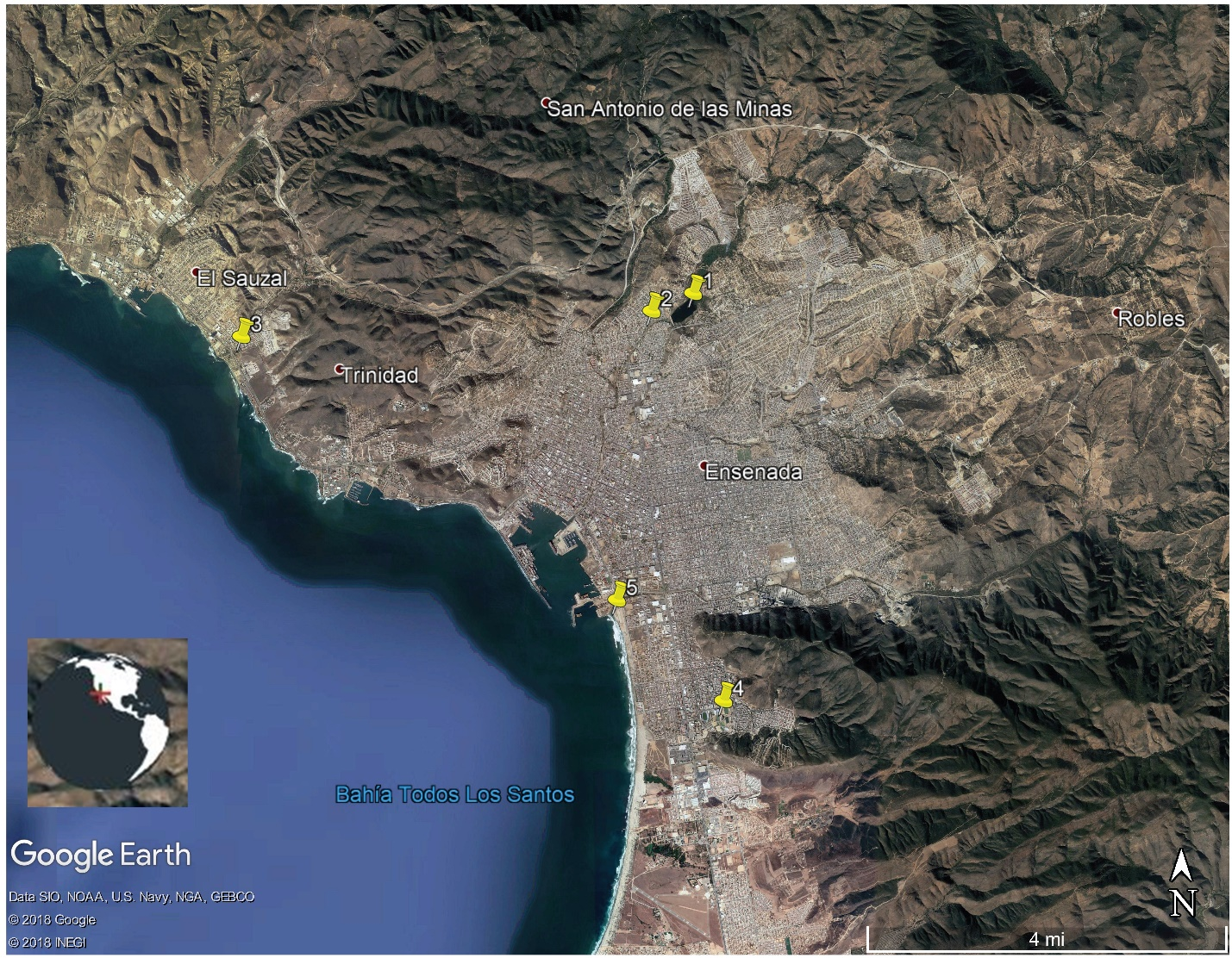 Figure 1 Treatment plants of sewage and Emilio López Zamora dam at Ensenada, Baja California city: 1, ELZ dam; 2, The Northeast; 3, Sauzal; 4, Naranjo; 5, Gallo.