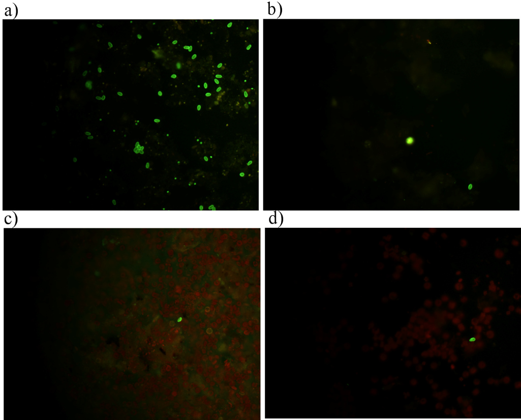 Figure 2 Detection of G. lamblia by DFA by epifluorescence microscopy at 40X; a) positive control, b) El Gallo, c) El Sauzal, d) El Naranjo. 40X.