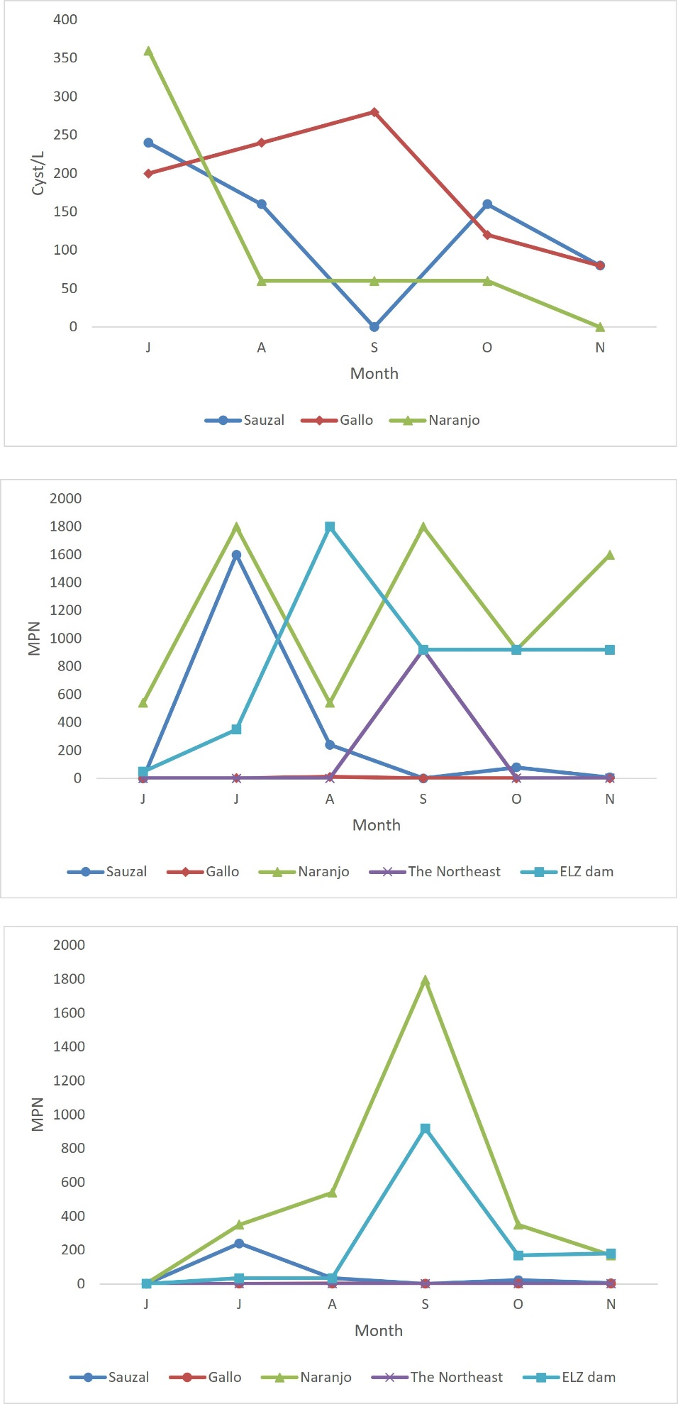 G. lamblia cysts were observed in the effluents from the wastewater of Gallo, Sauzal, and Naranjo (Figure 2). The higher number of cysts occurred at Gallo in September (280· L-1), while the lowest was observed in November (80· L-1). Naranjo has the highest in july (360· L-1) and the lowest in November (0· L-1). For Sauzal, the number of cysts fluctuated during the sampling months, being July the month with the highest concentration (240· L-1). There were no Giardia cysts throughout the study in the case of The Northeast and the ELZ dam.