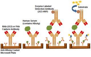 Monoclonal antibody was used for both captured and conjugated antibody but polyclonal antibody only was used capture antibody in the sandwich ELISA systems for HBsAg detection. HBsAg also was used for both captured and conjugated antigen for anti- HBsAg detection system. The MAb-HRP conjugated was exposed to accelerated stability experiment to detect its shelf life and activity.14,15