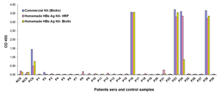 200 ng/well of anti-HBs 2G3 MAb was coated on ELISA plates. MAb coated plates results were better than PAb coated plates in laboratory studies, so MAb coated plates were used for sandwich ELISA systems all the field trials. As conjugate, homemade 2G3 MAb–HRP and 2G3 MAb–biotin were used in our ELISA kits. For testing of diagnostic ELISA kit, all validation experiments were done by using infected and non-infected human plasma samples by applying the steps in Figure 1 & Figure 2. In addition, same samples were tested in commercial kit (Dade Behring, Germany) including biotin conjugate. When HBsAg was present in human serum, it bound to both the captured and the conjugated antibody and the high OD450 values were measured. When HBsAg antigen was not in the human serum, it didn’t bind to any antibodies and the low OD450 values were measured on a Bio-Tech EIA reader. Infected and non-infected human plasma samples were obtained from The Istanbul Faculty of Medicine, ELISA Lab. In the studies of ELISA kit, HRP-conjugate and biotin conjugates were diluted in commercial conjugate diluent (Pierce). During the optimization studies, conjugate diluent was modified by adding the different percentages of the several animal sera (goat, mouse, fetal bovine) in PBS. Figure 6 shows that comparison of the field trials between homemade and commercial HBsAg ELISA kit with human sera.