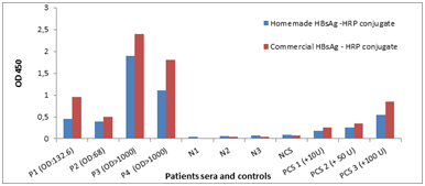 For anti-HBsAg detection, we conjugated commercial HBsAg antigen with the HRPO and determined the optimal dilutions of this conjugate as a 1/1000 to use them in ELISA kit applications. The homemade anti-HBsAg ELISA system was compared with the commercial kit by using 173 patients’ sera, it was shown that our system corresponded with the results of negative and positive samples at ratio of 91%. The performance of homemade HBsAg and Anti-HBsAg kits was compared with the commercial ELISA kits (eighth generation kit). All reference plasma samples, kindly provided by Dr. Derya Onel (Istanbul University, Capa Medical Faculty, and Microbiology Department) contained positive and negative human sera. The sandwich ELISA tests reviewed over the controls of the commercial kit both HBsAg and anti-HBsAg homemade kit.