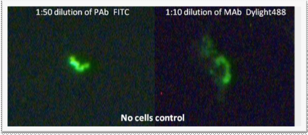 The first objective was to check if RF (Cat no. FNR01, Cytoskeleton, Inc.) Cross-reacts and binds to the control organisms when used with PAb. One mg/mL stock of RF was prepared and 1:10, 1:50, 1:100, 1:500, and 1:1000 dilutions of RF were tested with 1:50 dilution of PAb via two conditions.