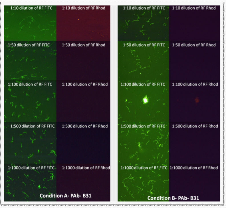 Figure 2 Rhodamine fibronectin tested at different dilutions (made from 1 mg/mL RF stock) with polyclonal antibody (1:50 dilution) on B. burgdorferi B31 and E. coli with Conditions “A” and “B.” E. coli did not stain; therefore the pictures are not included. Images were taken at 400x magnification.