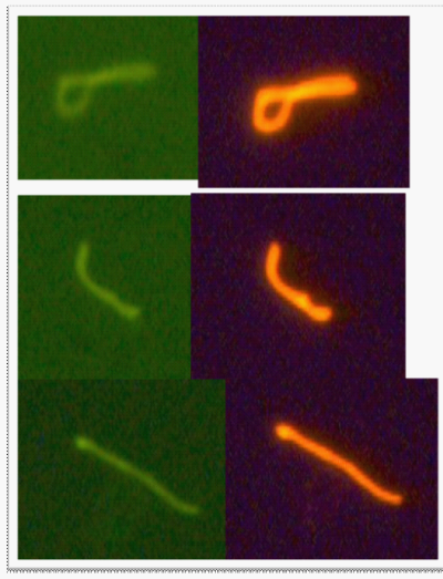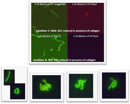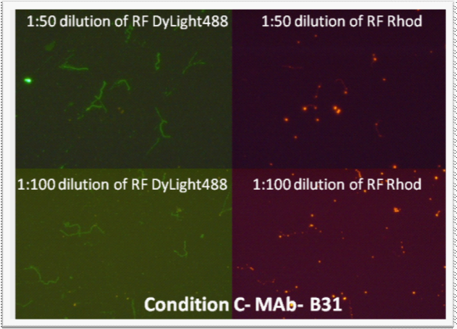 Figure 4 Top four pictures - Rhodamine-Fibronectin tested at 1:25 dilution (made from 1 mg/mL RF stock) with monoclonal antibody (1:10 dilution, “Condition C”) and polyclonal antibody (1:50 dilution, “Condition B”) on B. burgdorferi B31 and E. coli. E. coli did not stain; therefore the pictures are not included. Images were taken at 400x magnification.