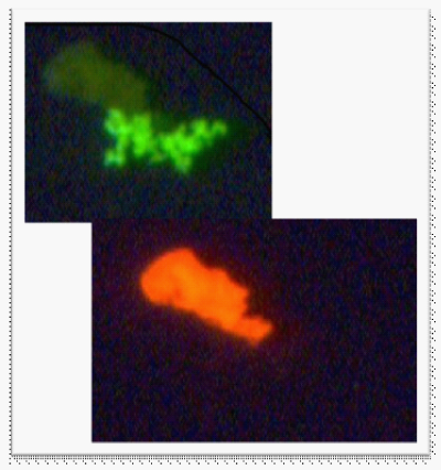Figure 5 This photograph shows three particles from a patient sample that stain with RF. The green portion is Ab-FITC and the orange is RF.